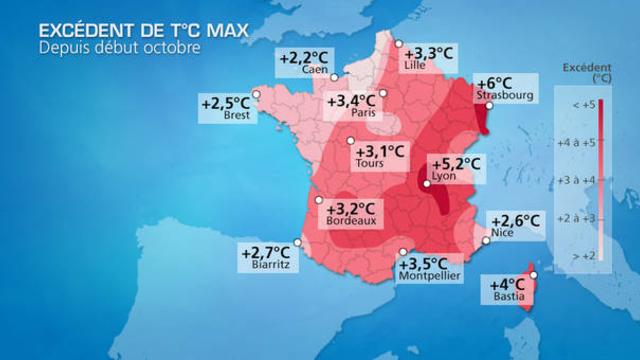 D'une manière générale, l'écart aux normales des températures (pour un mois d'octobre) affiche un excédent de +2,5°C à l'échelle de la France. Ce mois d’octobre doux est dans la continuité du mois de septembre anormalement chaud cette année (malgré l’absence de vague de chaleur cet été).