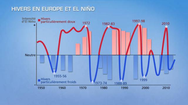 Corrélation entre l'occurrence d'hivers froids et doux en France (histogrammes) et le phénomène El Nino - La Nina (courbe).