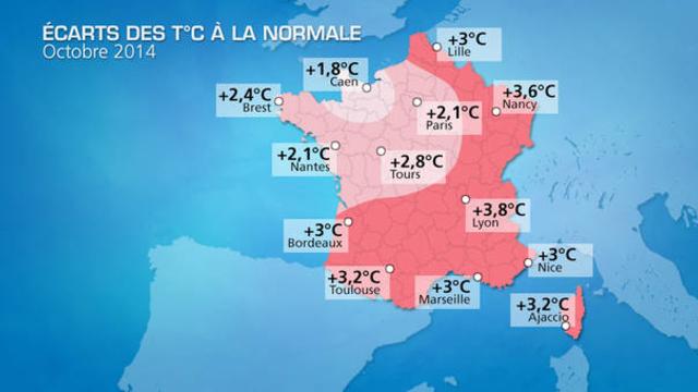 Le week-end des 18 et 19 octobre, la barre des 30°C a même été atteinte dans le Sud, en Aquitaine et en Corse. Il a fait 25°C à Paris et de 22 à 24°C près de la Manche. D'une manière plus générale, on se situe entre 2 et 3,5°C au-dessus des normales depuis le début du mois. C'est dans l'Est et en Aquitaine que l'excédent est le plus important : sur Mont-de-Marsan, Nancy et Lyon, il est de +4°C environ. A Ajaccio, la température maximale a dépsssé 25°C du 1er au 22 octobre inclus. A Biarritz, on compte pour le moment huit journées de chaleur depuis le début du mois (une journée de chaleur est comptabilisée à partir du moment où la température maximale atteint ou dépasse les 25°C). Une pointe à 31,5°C a même été enregistrée sur Mont-de-Marsan.