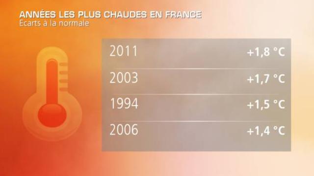 Il faudrait, pour se faire, que les températures restent dans les moyennes en novembre et en décembre, ce qui est d'ailleurs envisagé dans nos prévisions saisonnières. Dans ce cas de figure, l'excédent de température annuelle moyenné sur la France serait d'environ +1,1°. Ce serait alors la 3 ème ou 4 ème année la plus chaude. Mais si les températures dépassent encore légèrement ces seuils, le niveau annuel de 2014 pourrait se placer en deuxième ou troisième position après 2011 et 2003.
