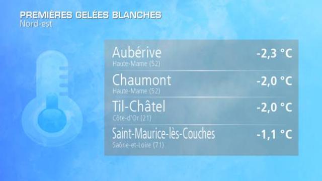 -2,3°C à Aubérive en Haute-Marne -2°C à Chaumont en Haute-Marne -2°C à Til-Châtel en Côte-d’Or -1,1°C à Saint-Maurice-lès-Couches en Saône-et-Loire.Ces gelées sont tout à fait normale à cette période de l’année et arrivent même légèrement en retard par rapport à la moyenne. Avec l’arrivée d’une nouvelle perturbation demain matin, l’ouest du pays ne connaitra pas de deuxième journée avec du gel, alors que dans l’est, elles seront encore possibles.