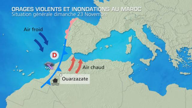 Ce week-end et plus particulièrement durant la journée de dimanche, des orages particulièrement violents ont éclaté dans le sud et le sud-est du royaume marocain. Ainsi, de nombreux oueds (rivières) au pied des massifs du Haut-Atlas et de l’Anti-Atlas sont entrés en crue. Habituellement à sec, ils n’ont pu contenir des quantités de pluies diluviennes tombées en quelques heures.
