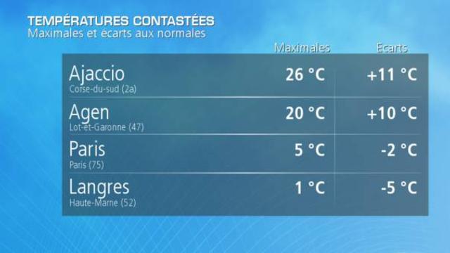 Les violentes intempéries dans le sud sont liées à un puissant conflit de masses d'air juste au-dessus de la France. Hier après-midi, les températures étaient comprises entre +1°C en Alsace et +26°C à Ajaccio.