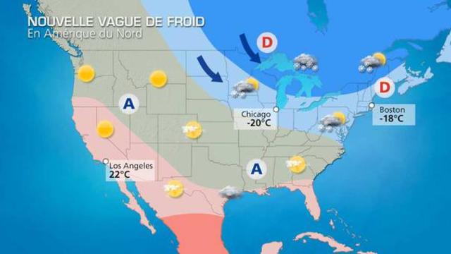 Cette nouvelle vague de froid trouve son origine dans la descente d'une masse d'air arctique détachée du pôle qui vient se centrer sur le Canada et qui impacte le nord des Etats-Unis. Les températures s'effondrent à -20 à -25°C jusqu'à jeudi entre Montréal et Chicago. A la faveur d'un ciel nocturne dégagé et d'une masse d'air arctique en altitude, le froid s'en trouve accentué, avec des pointes de -40 à à -50°C attendus dans le centre du Québec (le record de froid au Canada est de -54°C).