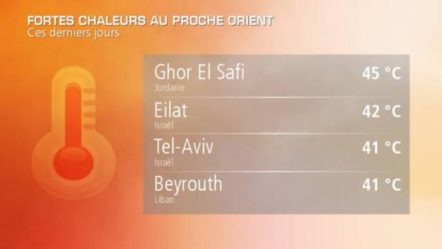 En mai à Tel-Aviv, sur la côte méditerranéenne d’Israël, les températures maximales sont normalement proches de 24 à 26°C. Pourtant ces derniers jours, le thermomètre est monté jusqu’à 41°C, un coup de chaleur précoce et particulièrement intense. Tout le Proche-Orient a connu des températures particulièrement chaudes, avec 45°C à Ghor El Safi (Jordanie), 42°C à Eilat (Israël), 41°C à Beyrouth (Liban), ou encore 37°C à Jérusalem (Israël).