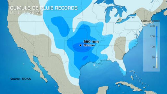 A Oklahoma City, il est tombé depuis le début du mois de mai 470 mm, soit plus des 3/4 de ce qu’il tombe à Paris en un an. D’ailleurs, le record de 369 mm datant de l’an dernier a été battu avec 470mm. A Norman, 660mm de pluies ont été recueillis, soit 5 fois plus que la moyenne. L’Oklahoma n’est pas le seul Etat touché, puisque le constat est le même au Texas, au Kansas, en Arkansas (avec 500mm de pluies à Fort Smith contre 347mm pour l'ancien record), au Nebraska ou encore au Missouri. De nombreuses victimes sont malheureusement à déplorer et des centaines de maisons sont détruites. D'immenses surfaces agricoles ont été touchées, avec des cultures qui pourissent sur pied.