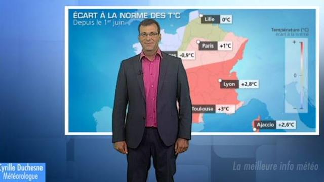 A Paris, il n'a quasiment pas plu en cette première quinzaine de juin (0,8 mm) alors que la moyenne est de l'ordre de 25 mm. Le déficit pluviométrique concerne en fait une large zone allant du Bassin parisien aux frontières du Nord ainsi que la partie ouest de la Bretagne. Sur les régions du Centre et la partie sud de la France, les précipitations ont été nettement plus généreuse et très excédentaires là où les orages ont donné de fortes précipitations. On relève par exemple 87 mm à Montpellier alors qu'il en tombe normalement 14 mm en 15 jours au mois de juin.