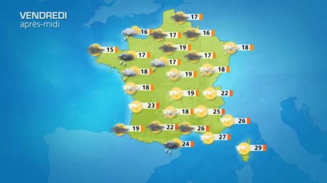 La fraîcheur est à nouveau au rendez-vous au lever du jour de ce vendredi avec des valeurs comprises entre 5 et 10°C sur les deux tiers nord du pays. Très localement, dans certaines campagnes, les valeurs peuvent s’abaisser en dessous. Près de la Méditerranée, les températures sont plus élevées avec des minimales affichant de 15 à 19°C et jusqu’à 22°C en Corse. L’après-midi, les maximales sont stables et toujours inférieures aux normes, affichant de 15 à 19°C au nord et jusqu’à 29°C pour l’île de beauté.