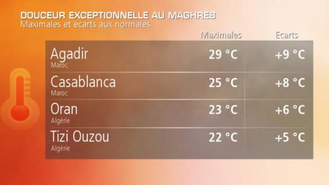 Depuis la fin de l’automne la douceur est remarquable sur le Maghreb en raison de la persistance des hautes pressions. Ce temps très doux s’accompagne d’une sécheresse qui s’aggrave rapidement.