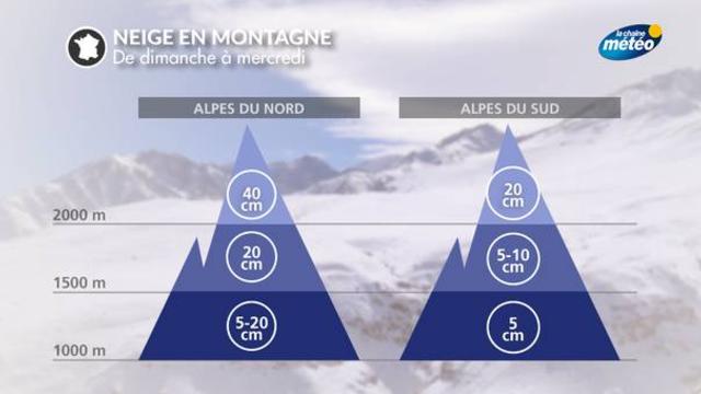 A 1600 mètres d'altitude, on attend de 20 à 40 cm de neige sur le nord des Alpes et de 10 à 20 cm dans le sud des Alpes. Dans les Pyrénées, jusqu'à 30 cm de neige sont attendus sur les Pyrénées-Atlantiques et les Hautes-Pyrénées. Dans le Jura, la couche pourra atteindre 15 cm. Sur le Massif-Central, l'épaisseur se situera entre 15 et 30 cm de neige. Enfin dans les Vosges, on attend à 1200 mètres jusqu'à 15 cm de neige.