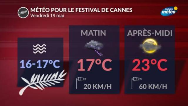 Cette édition 2017 a démarré sous des conditions idéales : une douceur sans chaleur excessive (24°C), et avec un soleil radieux.Changement de décor météo sur la croisette ce vendredi : le temps va changer radicalement dès cette nuit avec l'arrivée de la pluie, puis des orages. Cette dégradation s'intensifiera vendredi matin avec un risque de fortes pluies orageuses temporaires. La bonne nouvelle est l'amélioration rapide du temps en début d'après-midi avec le retour du soleil. La moins bonne : ce soleil s'accompagnera d'un vent soutenu. Si la température atteindra 20°C, le temps restera lourd en raison de la forte humidité.La température ressenti sera de 26°C vers 14h avant une baisse à 21°C à 19h.
