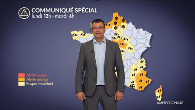 Des pluies s'étirent du sud-ouest aux frontières de l'Est jusqu'en Méditerranée avec des vents violents sur les régions atlantiques et en montagne. Dans le nord-ouest, le temps devient instable avec de fortes averses et de la neige sur le Nord-Picardie l'après-midi. En montagne, il neige abondamment au-dessus de 1600 mètres l'après-midi.