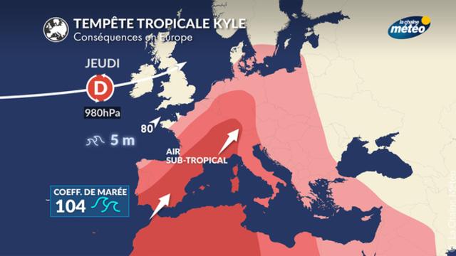Kyle est une tempête tropicale qui s'était formée sur la côte Est des États-Unis, et qui traverse actuellement l'océan atlantique. Reprise dans le flux d'ouest océanique, Kyle va atterrir jeudi et vendredi sur les îles britanniques en simple dépression classique. Mais cette remontée vers nos latitudes va faire remonter de l’air brûlant en provenance du Maghreb.