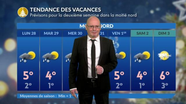 Le début de semaine sera très perturbé dans la continuité du dimanche 27 décembre : vent fort, pluies fréquentes, neige dès 500 m en allant vers les Vosges, les Ardennes, et un ressenti maussade et froid partout. A partir de mardi, un temps variable à giboulées s'installe pour le reste de la semaine, un peu comme en mars.