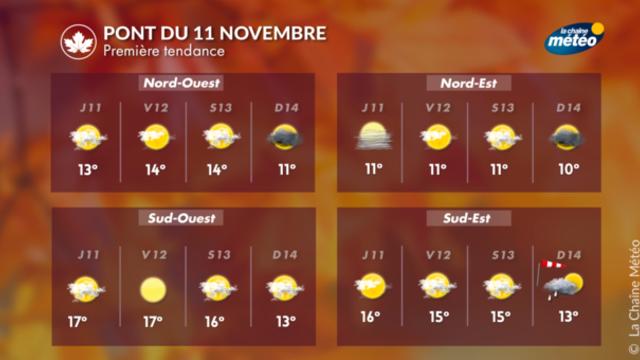 Un anticyclone protégera la France pour le pont du 11 novembre. Mais, à cette époque de l'année, ces conditions s'accompagnent souvent de brouillards matinaux et de nuages bas. Ce sera le cas pour le jeudi 11 novembre, qui se déroulera au sec. Les brouillards risquent d'être tenaces au nord-est dans une ambiance fraîche. Au nord-ouest, des éclaircies réussiront à percer et il fera bon en Bretagne et Pays de la Loire notamment. Pour la moitié sud, les brouillards seront présents dans les plaines d'Aquitaine, puis laisseront place à un temps ensoleillé et assez doux. Au sud-est, le beau temps sera présent, mais la Corse risque de subir encore des orages, qui seront ensuite en atténuation.