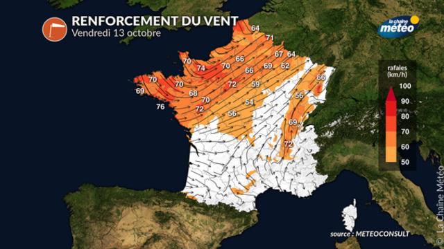 Jusqu'à vendredi, la France est sous l'influence d'un anticyclone qui va se replier vers le bassin méditerranéen ce week-end et laisser place à une perturbation. À son passage, le vent va se renforcer près de la Manche dès vendredi matin, atteignant 80 km/h. Dans le courant de l'après-midi, la perturbation gagnera les Pays de la Loire, la Haute-Normandie et les Haut-de-France. C'est sur les Hauts-de-France que les rafales s'annoncent les plus fortes, avec un risque de formations tourbillonnaires (tornades).