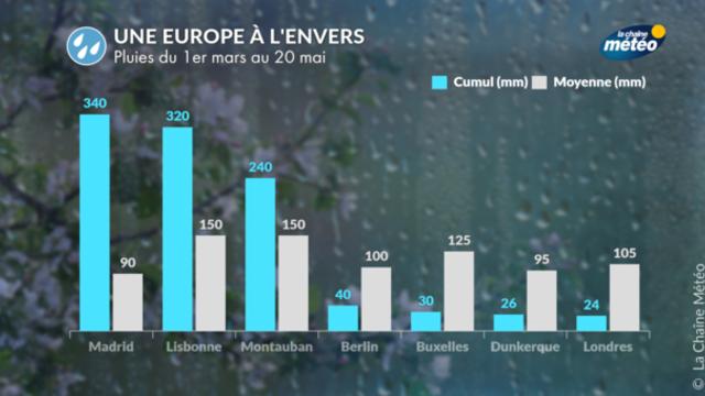 À l’opposé, le sud du continent, et notamment l’Espagne, le Portugal et le sud de la France, ont vécu un printemps inhabituellement humide. En cause : les perturbations contournant l’anticyclone nordique par le sud. Résultat, un des printemps les plus arrosés depuis 40 ans dans la péninsule Ibérique, des paysages verdoyants dignes de la campagne anglaise et des barrages bien remplis.