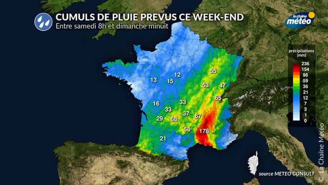 On attend de fortes intensités pluvieuses (20–40 mm fréquents, 50–80 mm localement ; jusqu’à 80–120 mm possibles en relief cévenol en cas de lignes peu mobiles), grêle ponctuelle, rafales violentes au passage des orages. Des cumuls marqués et un risque d’inondations locales sont envisagés du Languedoc, Cévennes à la moyenne vallée du Rhône. L'axe pluvieux actif qui s’étirera des Pyrénées vers le Nord-Est pourra aussi engendrer des cumuls significatifs (30 / 40 mm).