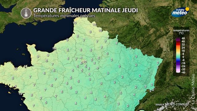 Sous l'effet combiné de conditions anticycloniques, d'un vent faible et d'une masse d'air continentale plus sèche (moins de brouillards et nuages bas), la fraîcheur matinale s'accentue ce jeudi. Les températures en villes seront généralement comprises entre 1 et 5°C au lever du jour du centre au nord-est mais des les campagnes les plus abritées, les températures pourront descendre à 0°C ou légèrement en dessous de 0°C avec les premières gelées blanches en plaine.