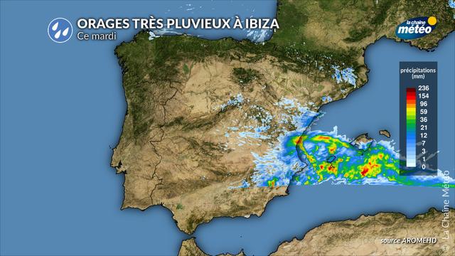 Après avoir touché la côte est de l'Espagne dans la journée de lundi, les orages accompagnés de pluies diluviennes touchent l'île d'Ibiza ce mardi. Il est tombé 134 mm depuis minuit sur l'aéroport d'Ibiza, soit l'équivalent de 2 mois de pluie. Il est même tombé jusqu'à 236 mm à Eivissa, soit l'équivalent de 4 mois de pluie. Ces pluies torrentielles sont à l'origine de crues éclairs et inondations.