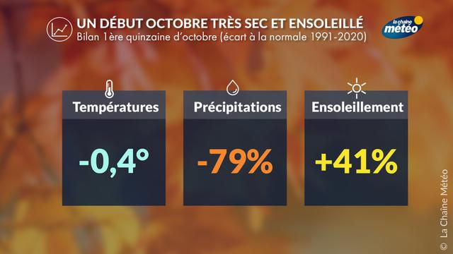 Avec la prédominance de conditions anticycloniques, cette première quinzaine d'octobre a été peu arrosée avec une longue période de temps calme du 5 au 15 octobre. L'ensoleillement a été exceptionnel dans l'ouest et plus réduit en allant vers le nord et l'est avec des journées où les nuages bas ont eu souvent du mal à se dissiper. Les températures sont légèrement déficitaires par rapport à la normale 1991-2020