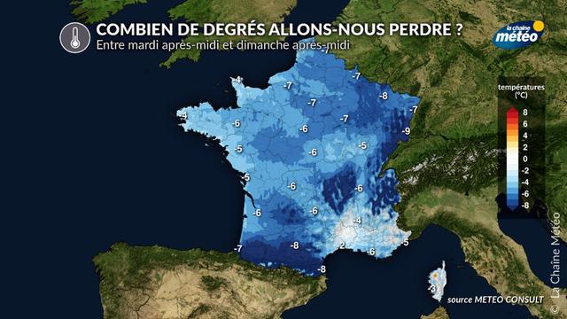 Les températures seront généralement comprises entre 8 et 10°C l'après-midi dans le nord-est, 10 et 13°C sur le reste du pays à l'exception des rivages de la Méditerranée où l'on attend des pointes entre 15 et 18°C. Ces températures seront dignes d'une mi-novembre dans l'ouest et le nord avec un ressenti assez froid exposé au vent de nord-ouest et avec l'humidité ambiante.