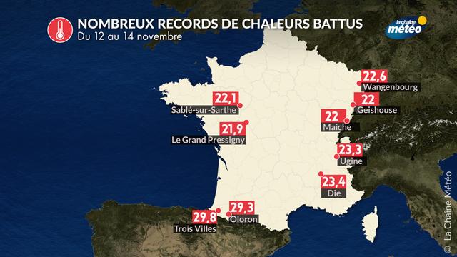 Dans l'est, des records de chaleur ont été battus dans l'après-midi du 13 novembre avec des valeurs dignes d'un mois de mai (22 à 23°C). Quelques records de chaleur ont également concerné le Centre-Val de Loire avec 22,1°C à Sablé-sur-Sarthe.