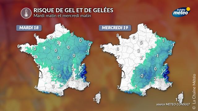 Sous un ciel nocturne souvent dégagé de lundi à mardi et mardi à mercredi, les premières gelées généralisées de la saison sont attendues dans les campagnes du Nord et du Centre, ainsi que dans les vallées de l’Est : une date tardive, alors que les premières gelées surviennent en moyenne entre fin octobre et début novembre dans ces régions. Les fonds de vallées, plateaux intérieurs et zones de montagne seront les plus exposés, avec localement –2 à –4 °C au petit matin, ce qui n'a rien d'exceptionnel pour la saison. En montagne, le gel sera par contre rigoureux : on attend de -10°C à -15°C dans les stations d'altitude dans les Alpes.