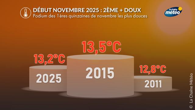 Avec un indicateur thermique national de 13,2°C, la première quinzaine du mois de novembre 2025 arrive en 2ème position des plus douces depuis 1930. Seul le début du mois de novembre 2015 avait été plus doux avec un indicateur thermique national de 13,5°C.