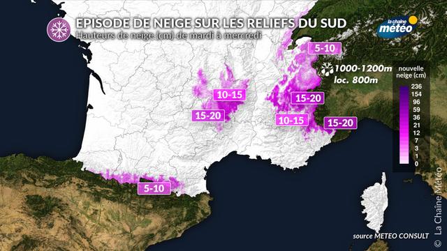 Des chutes de neige se produisent entre mardi après-midi et mercredi sur le sud du Massif central dès 1000 à 1200 m. Par isothermie, la limite pluie-neige peut même s'abaisser à 800 m sous les plus fortes intensités. Il s'agira d'une neige lourde et collante, chargée en humidité. Les massifs des Cévennes, les monts de la Margeride et du Vivarais sont les plus exposés avec des hauteurs de neige pouvant atteindre une vingtaine de centimètres dès 1300 m. La partie sud des Alpes et les Alpes frontalières seront touchées dans la journée de mercredi avec 10 à 20 cm de neige fraîche au-dessus de 1200 m.