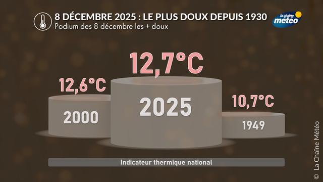 Ce 8 décembre 2025 se hisse à la 1ère place du podium des 8 décembres les plus doux depuis 1930, juste devant le 8 décembre 2000 qui avait été exceptionnellement doux aussi. Des records mensuels de douceur ont été battus dans certaines stations météo comme celle du Mans où avec 19,1°C, il n'avait jamais fait aussi doux en décembre depuis l'ouverture de la station en 1944. La station de Saint-Sauveur sur l'île d'Yeu (Vendée) avec 17,5°C bat le record mensuel de douceur datant de 1983 avec 16,8°C.