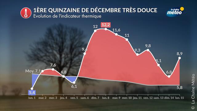 Après des températures proches de la normale du 1er au 5 décembre, une période de douceur exceptionnelle a concerné la France du 7 au 10 décembre. La journée du 8 décembre a été la plus douce jamais observée depuis 1930. Des records mensuels de douceur ont été battus dans certaines stations météo comme celle du Mans où avec 19,1°C, il n'avait jamais fait aussi doux en décembre depuis l'ouverture de la station en 1944. La station de Saint-Sauveur sur l'île d'Yeu (Vendée) avec 17,5°C bat le record mensuel de douceur datant de 1983 avec 16,8°C.