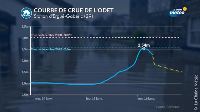 Dans le sud du département, l’Odet (29) a atteint 2,54 m en fin de nuit, un pic déjà significatif.