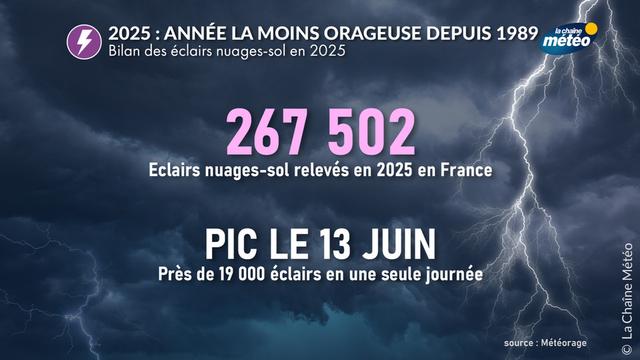 Le bilan des orages et du foudroiement en France pour l'année 2025 présente une faible saison orageuse, la plus faible depuis le début des relevés d'observation de Meteorage datant de 1989, malgré quelques épisodes remarquables, selon les chiffres communiqués par notre partenaire Météorage.