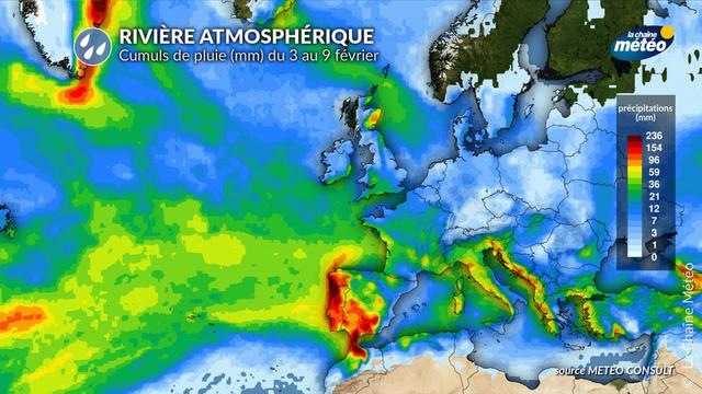Cette semaine, des intempéries touchent l'Europe occidentale, avec d'abondantes pluies prévues sur la péninsule Ibérique et le nord du Maghreb. Jusqu'à 200 mm de pluie sont prévus au Portugal, et localement plus de 300 mm au nord du Maroc, avec un risque d'inondations marqué.