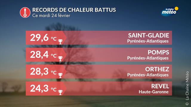 Avec un flux orienté au sud, ramenant de l'air d'origine subtropicale auquel s'est ajouté un effet de foehn, au pied des Pyrénées, les températures ont atteint des sommets pour une fin de mois de février. Plusieurs records mensuels de températures ont été battus avec 28,3°C à Orthez et jusqu'à 29,6°C à Saint-Gladie dans les Pyrénées-Atlantiques. A Revel en Haute-Garonne, il n'avait jamais fait aussi chaud en février depuis l'ouverture de la station en 1928 avec 24,3°C (ancien record 24°C en 2019).