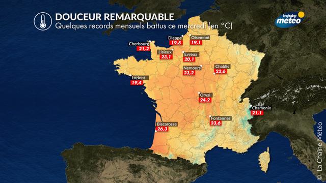 Cette semaine, l'anticyclone règne en France, avec un temps calme et sec sur une grande partie du pays. Grâce au flux de sud, les températures sont exceptionnellement douces ce mercredi, avec de nombreux records mensuels battus sur le territoire.