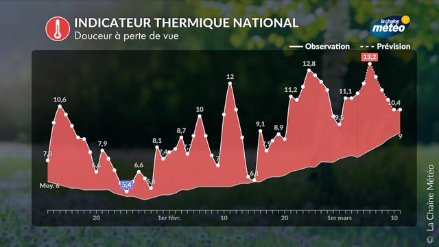 Depuis le 12 janvier, l’indicateur thermique national est resté constamment au-dessus des normales de saison. Une situation remarquable qui dure désormais depuis plus de 50 jours et qui pourrait se prolonger jusqu'à mi-mars. Si cette tendance se confirme, la France pourrait connaître près de deux mois consécutifs de douceur, un phénomène inédit depuis le début des relevés.