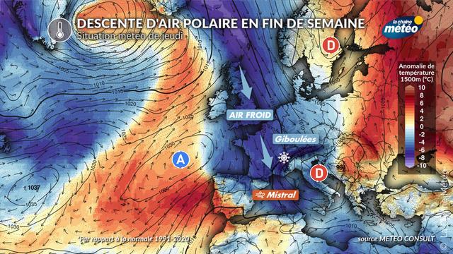 Mais cette situation va rapidement évoluer. À partir de mercredi, un vaste système dépressionnaire va s'installer sur l'Europe du Nord tandis que l'anticyclone des Açores va s'étendre en direction de l'Irlande, faisant basculer le flux au nord-ouest sur la France. Ce changement de circulation va permettre à de l’air nettement plus froid, en provenance des hautes latitudes, de plonger vers la France.