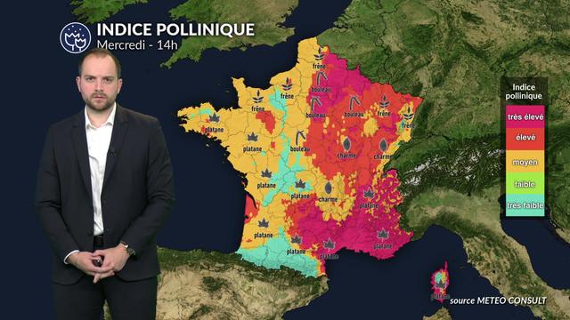Ce mercredi, malgré une couverture nuageuse dense au nord, le risque allergique reste moyen à très élevé (3/5 à 5/5) pour les pollens de bouleau, de frêne et de charme. Les régions concernées par ce risque sont surtout la Bretagne, les Pays de la Loire, l'Île-de-France, les Hauts-de-France, le Grand Est, la Bourgogne-Franche-Comté ainsi qu'en Auvergne-Rhône-Alpes.