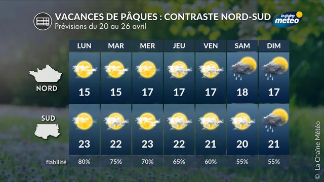 La première semaine des vacances de Pâques pour la zone C, du 20 au 26 avril, s’annonce contrastée entre le nord et le sud du pays. Sous l’influence d’un flux de nord-est, le temps restera sec et ensoleillé au nord, tandis que le sud connaîtra une douceur quasi estivale mais plus instable, notamment près des reliefs.