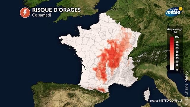 Dès la mi-journée de samedi, les premiers orages pourraient se développer entre le bassin parisien, les régions centrales et l'ouest du Massif central. Avec la progression du front en flux d'ouest, les orages se développent en fin d'après-midi et en cours de soirée de samedi entre l'Auvergne et la Bourgogne. Par la suite, ces orages progressent vers l'est du pays tout en perdant en intensité en cours de nuit de samedi à dimanche.