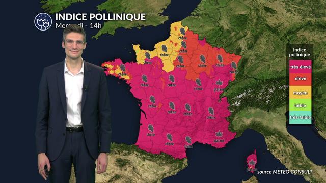 L'indice pollinique est modéré (3/5) sur les Hauts-de-France, sur la Haute-Normandie, la Basse-Normandie ainsi que sur une partie de la Bretagne, pour le pollen de chêne. Le risque pollinique est moins élevé car un front pluvieux va traverser les côtes bretonnes et normandes. La pluie va plaquer les pollens au sol, et limite la dispersion des pollens dans l'atmosphère sur ces régions.