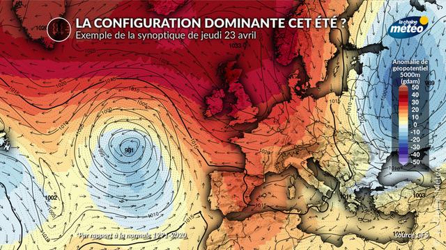 La configuration météorologique globale attendue pour cet été ressemble à celle prévue pour cette fin de semaine (notre carte : hautes pressions nordiques dominantes, et dépression au large atlantique). Même si le mois d’avril actuel est dominé par des conditions anticycloniques, il ne constitue cependant pas un indicateur fiable pour la saison estivale. La circulation atmosphérique du printemps reste très variable, et la corrélation avec les régimes météo de l’été est statistiquement faible. Par exemple, le printemps 2011, très chaud et sec, avait été suivi d’un été finalement orageux, tandis que 2017 ou 2020, également marqués par des conditions printanières stables, n’avaient pas débouché sur des étés durablement secs. À l’inverse, 2022 reste un cas plus rare où un printemps sec a précédé un été très sec.