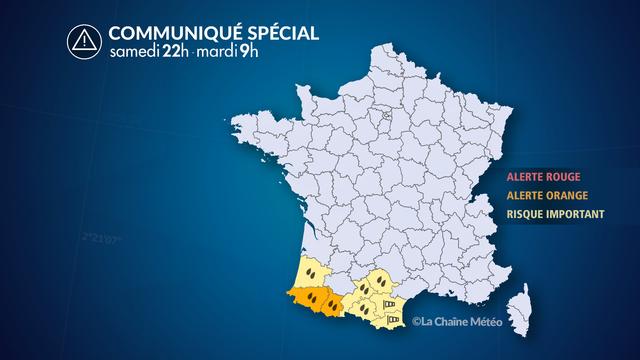 Ainsi, de dimanche à mardi matin, une perturbation vient se bloquer près des Pyrénées, apportant un épisode remarquablement durable de précipitations d'intensité modérée à forte au cours duquel on attend 50 à 100 mm d'eau, et localement 200 à 250 mm, ce qui correspond entre 1 et 2 mois de pluies.