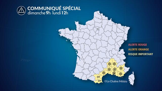 - de la neige jusqu'en plaine et en bord de mer, pouvant donner 1 à 5 cm localement dans la nuit de dimanche à lundi des Bouches-du-Rhône à la basse vallée du Rhône jusqu'à l'Hérault ,10 à 20 cm vers 700 mètres avec des conditions de circulations difficiles sur le réseau de montagne du sud des Alpes et du sud du Massif central.