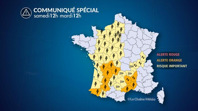 La dégradation orageuse est en place entre les Pyrénées, l'Aquitaine, le Limousin, et tout le centre-ouest de la France. Les orages les plus forts éclatent entre la Garonne et le Limousin, avec des chutes de grêle et de puissantes rafales de vent jusqu'à 100 km/h. Sur le Val de Loire, les cumuls de pluie s'annoncent importants. En milieu de soirée, ces orages remontent jusqu'à la Normandie, touchant aussi, dans une moindre mesure, l'Ile-de-France. L'accalmie sera assez rapide après 23 heures. Les cumuls de pluie pourront atteindre 40 à 50 mm sous les orages les plus forts, pouvant entraîner de forts ruissellements et des inondations ponctuelles.