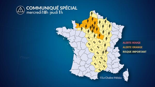 Dans le même temps, des orages ponctuellement forts éclatent du Lyonnais jusqu'en Normandie et à la Picardie en passant par la Bourgogne et le bassin parisien ce mercredi soir jusqu'en milieu de nuit de mercredi à jeudi. Ces orages peuvent s'accompagner de grêle et de fortes pluies brutales.