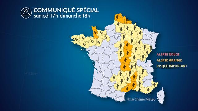 Une nouvelle salve pluvio-orageuse remonte de Méditerranée et gagne rapidement l'Auvergne-Rhône-Alpes jusqu'au Jura. Ces orages peuvent se montrer ponctuellement violents entre la Corse et la Provence côte d'Azur jusqu'aux Cévennes avec un risque de grêle. Des pluies intenses traversent la région lyonnaise et stéphanoise. Dans le même temps, il continue de pleuvoir abondamment de la Bretagne à la Basse-Normandie avec un fort vent d'ouest le long du littoral.