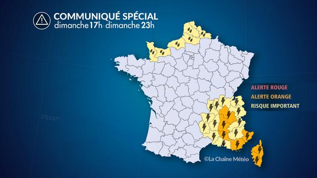 Une dernière salve pluvio-orageuse remonte de Méditerranée et gagne rapidement l'Auvergne-Rhône-Alpes jusqu'au Jura. Ces orages peuvent se montrer ponctuellement violents entre la Corse et la Provence Côte d'Azur jusqu'aux Cévennes avec un risque de grêle. Des pluies brèves mais intenses traversent la région lyonnaise et stéphanoise. Dans le même temps, il continue de pleuvoir abondamment en Normandie avec un fort vent d'ouest le long du littoral. ce front froid très actif balaie également le littoral du Nord-Pas-de-Calais.